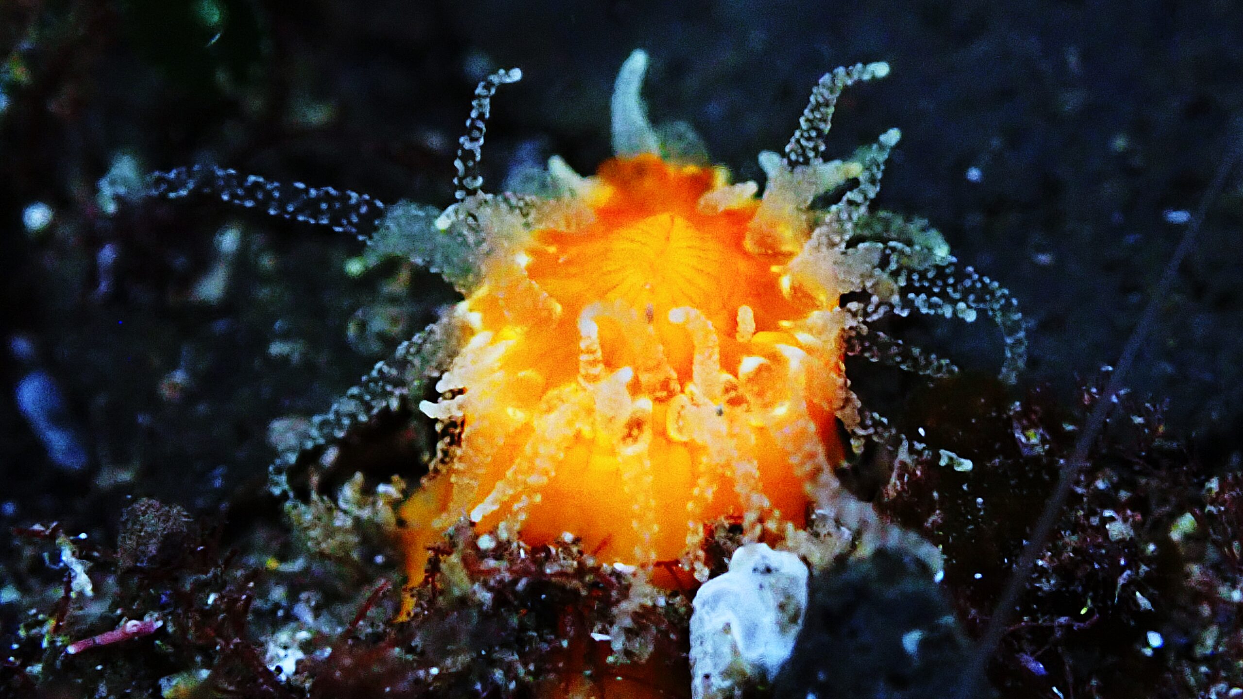 Coral solitario de pequeño tamaño, generalmente cilíndrico, con un cáliz circular que se alarga con la edad. El esqueleto es poroso, con 48 septos en cuatro ciclos y columela frágil en forma de estrella. Los pólipos son de color naranja o amarillo. En Canarias, habita desde el intermareal hasta unos 15 m de profundidad, especialmente en charcos, grietas y zonas sombreadas con algas fotófilas. Común cerca de praderas de Treptacantha abies-marina, también se encuentra en paredes y techos de cornisas, pero evita cuevas profundas. Puede aparecer en seco durante la bajamar y a veces está incrustado por algas calcáreas. Es solitario, aunque ocasionalmente dos individuos pueden compartir una epiteca. Se ha registrado en todas las islas e islotes del archipiélago.